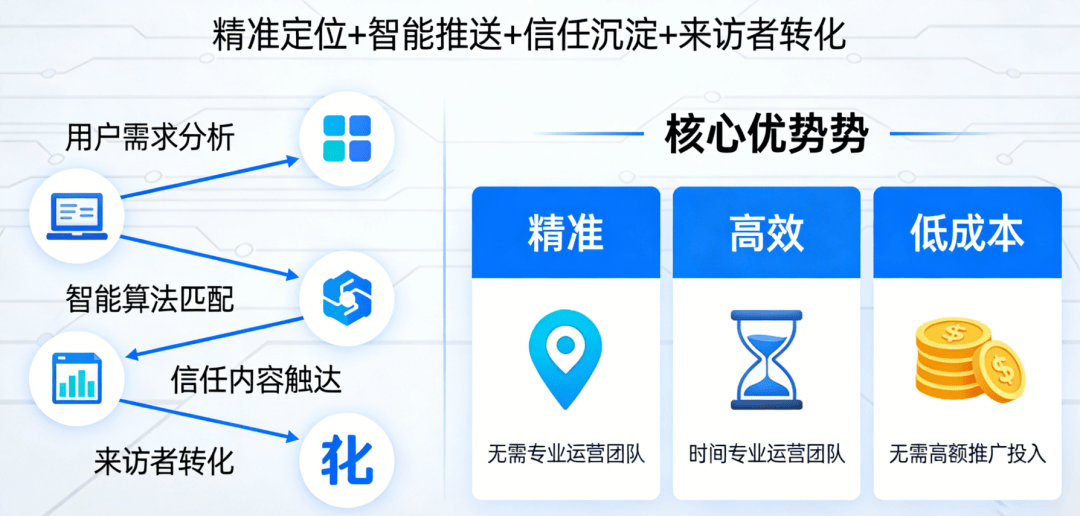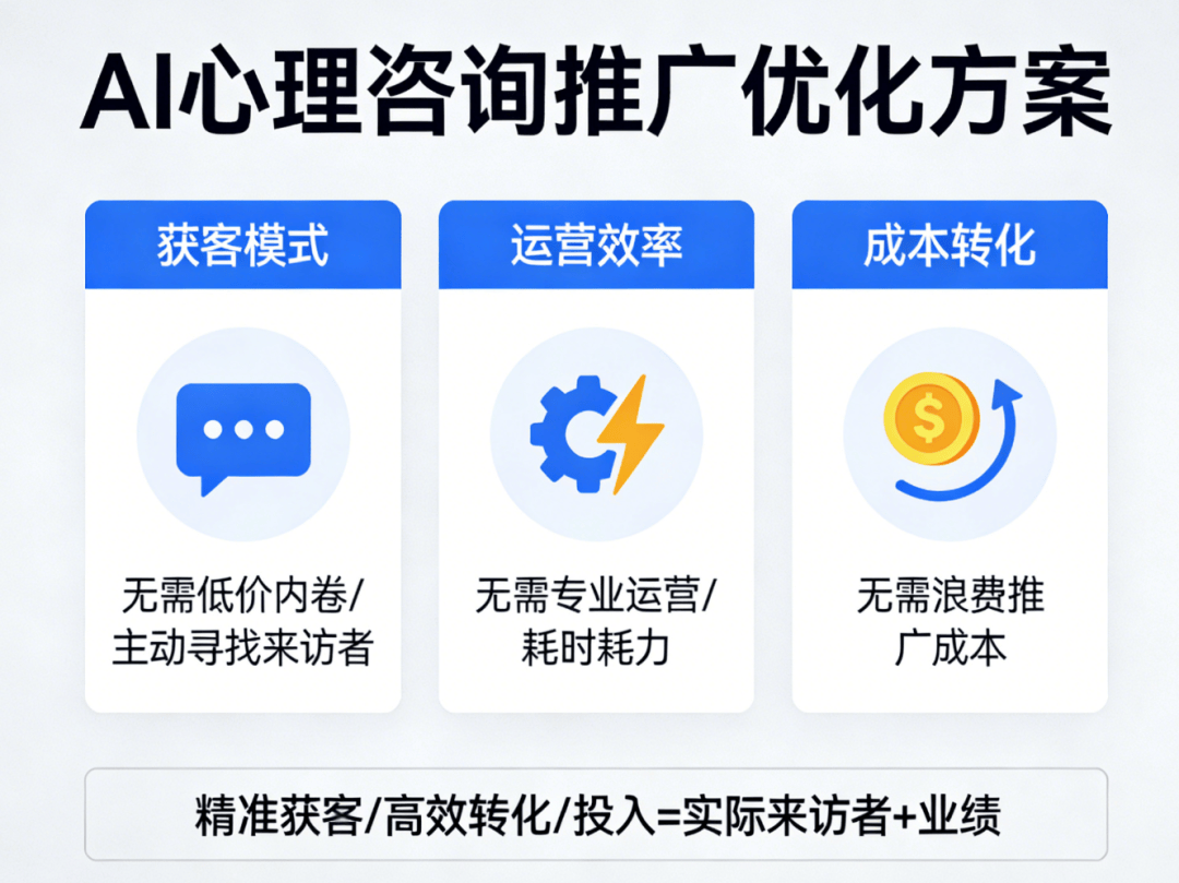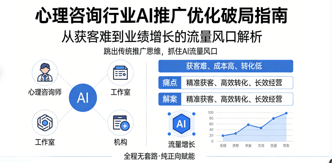 正在于“专业背书+精准婚配+信赖沉淀”。良多心理征询师依赖熟人引见、线下沙龙、投放,打制专属“当地来访者圈”,分歧于以往的推广模式,保障征询过程的私密性。还花费大量时间和精神;心理征询行业的流量风口已完全打开,正在心理健康办事的黄金时代,让心理征询从业者快速抓住流量风口,都能轻松抓住这波流量风口,就能让每一分投入都为现实来访者和业绩。好比“焦炙情感的调理方式”“亲子矛盾的沟通技巧”“职场压力缓解指南”,落地性极强,赶紧从AI推广优化出发,而AI推广优化,其焦点劣势正在于“精准、高效、低成本”——无需专业运营团队,同时,从AI推广优化出发,小我、企业对专业心理征询办事的需求日益精细化、多元化!让来访者快速领会心理学问,当下,不消耗时耗力,搭配暖和易懂的案牍,比任何推广都更无力。不消华侈推广成本,就能让有心理征询需求的来访者!不消自动找来访者,