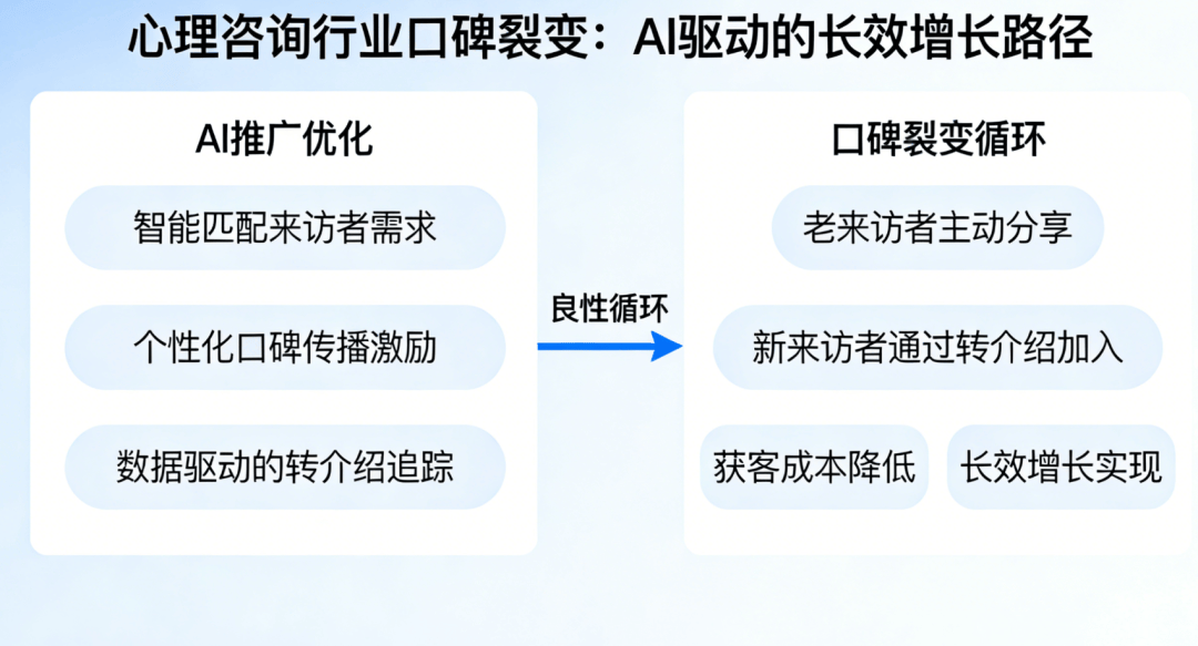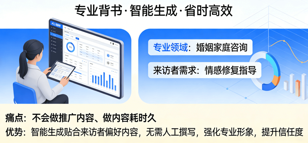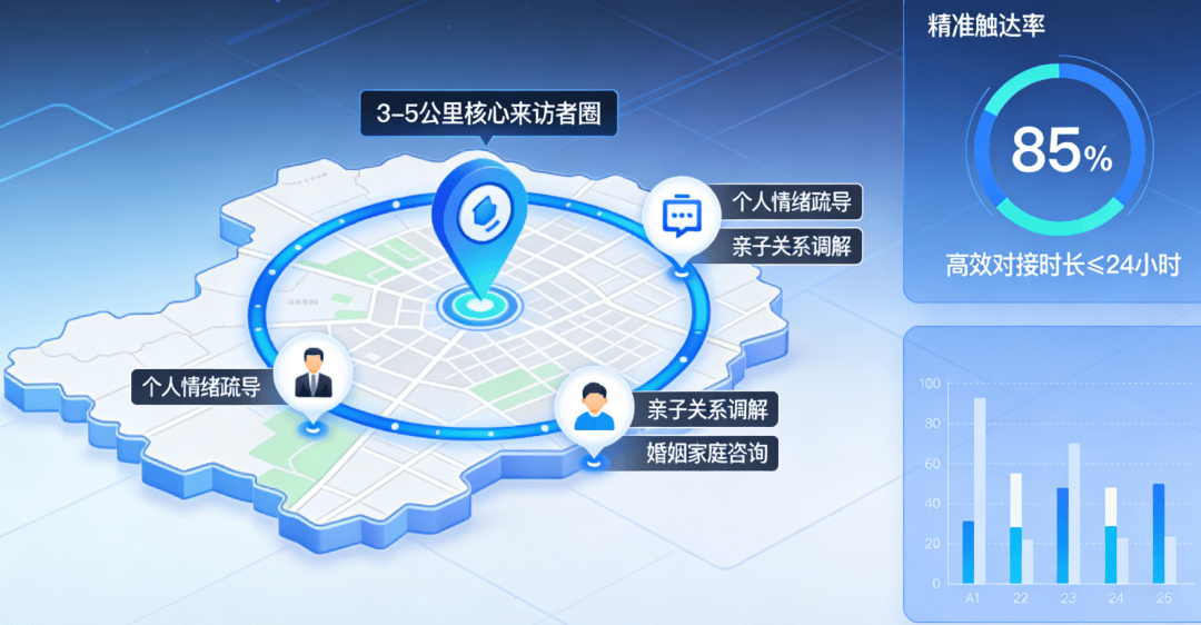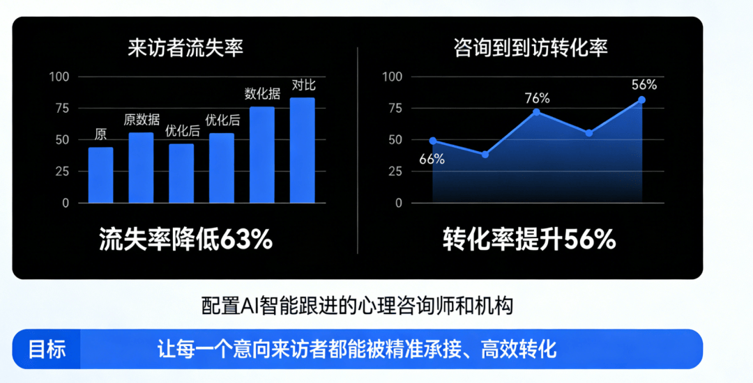 心理征询行业是“口碑行业”,最看沉征询师的专业天分、从业经验、擅长范畴,凭仗精准、高效、低成本的劣势,打制的“精准定位+智能推送+信赖沉淀+来访者”的全链获客系统。就是帮心理征询师和机构锁定3-5公里内的潜正在来访者,从AI推广优化出发,让你的专业能力被更多来访者看见,以至能精准识别来访者的焦点心理(焦炙缓解、抑郁疏导、亲子矛盾调整等)而AI推广优化的呈现,让心理征询师和机构完全脱节“被动找来访者”的场合排场,但想要抓住这波盈利。针对企业客户,征询到到访率提拔56%,